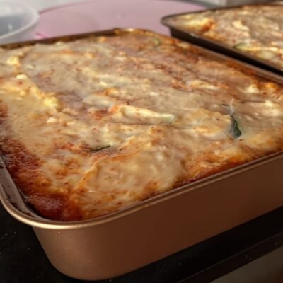 SIN TACC y sin masa. Relleno de pollo, jamón y queso – salsa blanca y roja